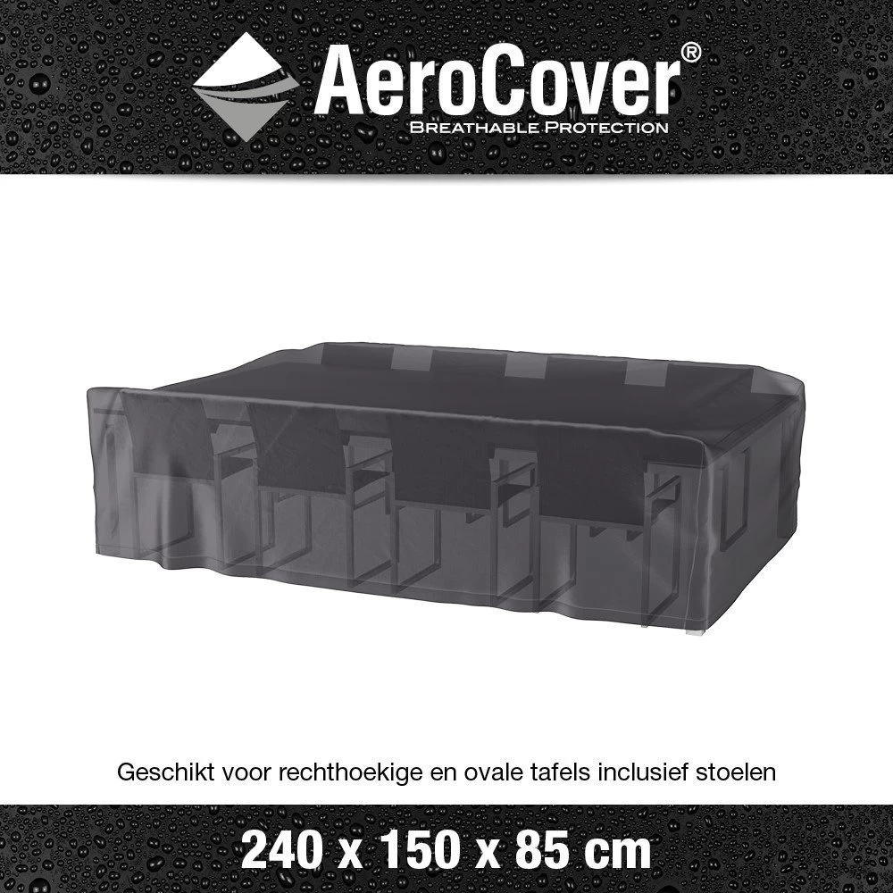 AeroCover tuinmeubelhoes. Ademende tuinmeubelhoes voor tuinset van 240x150cm. O.a. geschikt voor rechthoekige tafels van 220cm tot 240cm met stoelen. AeroCovers zijn ademend, waterbestendig, reduceren condensvorming en gaan schimmelvorming tegen. De stof heeft een hoge kleurechtheid dankzij de door en door geverfde vezels. Een AeroCover hoes verlengt de levensduur van uw tuinmeubelen. AeroCovers zijn vervaardigd van sterk en lichtgewicht ripstop polyester. Ze zijn makkelijk hanteerbaar en nemen weinig ruimte in wanneer niet in gebruik. De afdekhoes is voorzien van rijgkoord met 2 stoppers voor een goede pasvorm. Inclusief handige opbergtas. AeroCover stoffen zijn 100% waterdicht, de naden zijn, net als elke ander hoes, spatwaterdicht.