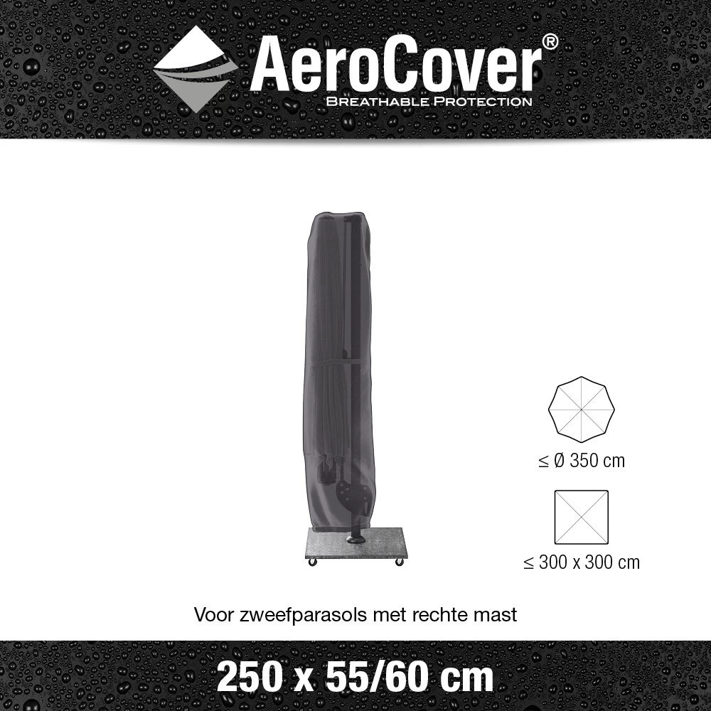 AeroCover parasolhoes voor zweefparasol 250×55/60cm. Ademende zweefparasolhoes geschikt voor zweefparasols met rechte mast ≤ Ø 3,5m en ≤ 3x3m. Handige ingenaaide stok om uw parasolhoes makkelijk over de parasol te plaatsen zonder een trap te gebruiken. AeroCover parasolhoezen zijn ademend, waterbestendig, reduceren condensvorming en gaan schimmelvorming tegen. De stof heeft een hoge kleurechtheid dankzij de door en door geverfde vezels. Een AeroCover beschermhoes verlengt de levensduur van uw parasol. AeroCover stoffen zijn 100% waterdicht, de naden zijn, net als elke ander hoes, spatwaterdicht.