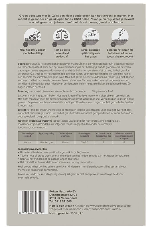 Last van mos in het gazon? Pokon Mos Weg! is een effectieve manier om dit probleem op te lossen. Met deze mosbestrijder, die bovendien gazonmest bevat, wordt mos snel verwijderd en je gazon direct gevoed. De gazonmest bevat essentiële voedingsstoffen die ervoor zorgen dat het gazon beter bestand is tegen mos. Mos kun je het beste behandelen van maart t/m mei en van september t/m december (niet in de zomer toepassen). Voor een optimale behandeling is het belangrijk dat de grond niet bevroren is, dat er geen zware regen wordt verwacht en dat de buitentemperatuur niet te hoog is (het gras kan verbranden). Maai het gazon de eerste 4 dagen na toepassing niet. Binnen een week zal het mos zwart/bruin worden en afsterven. Na twee weken kan het dode mos worden verwijderd, bij voorkeur door middel van verticuteren. Indien noodzakelijk kan de behandeling na 90 dagen worden herhaald.